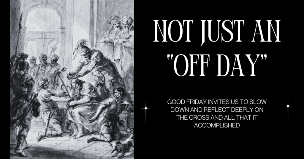 During the prayer request time of our early morning AWAKEN Bible Study at a local coffee shop, one of our Student parents, Jacqueline Hines, said, “Pray that tomorrow (Good Friday) won’t just be a day off.” I thought about that the rest of the day on Maundy Thursday, and asked myself, “How can I make Friday of Holy Week not just another off day?” We all know the significance of Good Friday, but sometimes we forget just how pivotal it is for us as followers of Jesus.
